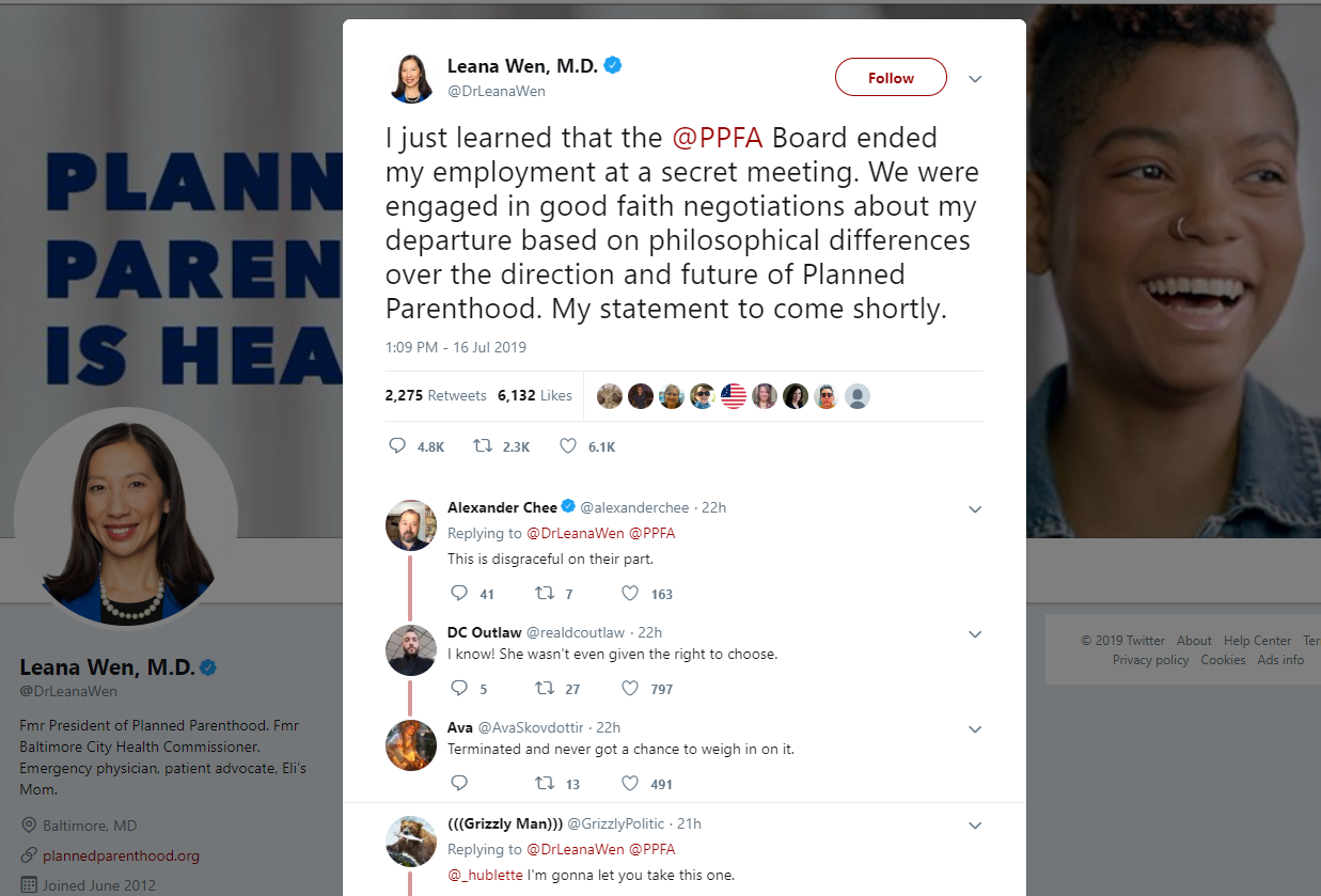 - Emma O’Connor, Ruby Cramer. “Planned Parenthood Has Ousted Its President, Leana Wen, Amid A Dispute Over The Organization’s Direction.” Buzzfeed News. July 16, 2019. Accessed July 17, 2019. https://www.buzzfeednews.com/article/emaoconnor/leana-wen-out-planned-parenthood-president